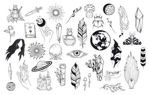 Big Witchcraft Set With Celestial Hands Witch Elements Evil Eye Feathers Candles Mushrooms Crystals Vector Isolated Mystical Illustration Stock Illustration Download Image Now Istock